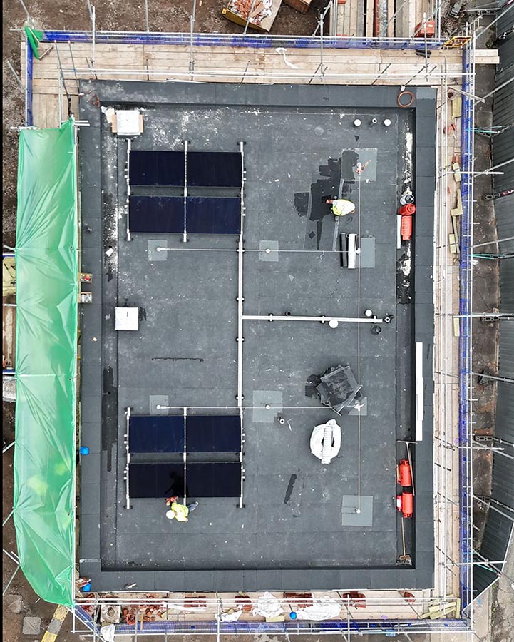 A new extension was being built, comprising new office space and a food servery for student meals. The college also wished to incorporate energy-saving measures into the new development, so a number of energy-saving technologies were built into our design, including heat recycling and solar panels.